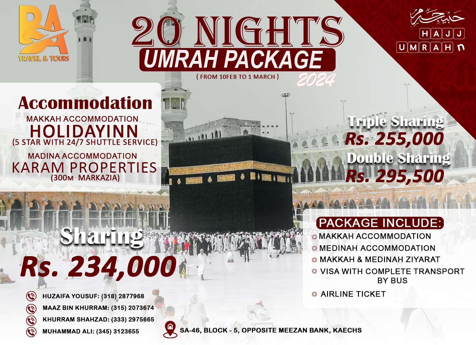 Book your 20 Nights Umrah Package from 10 Feb to 1 March 2024 with 5-star Makkah accommodation, Madinah stay, visa, transport, and airline ticket included.
