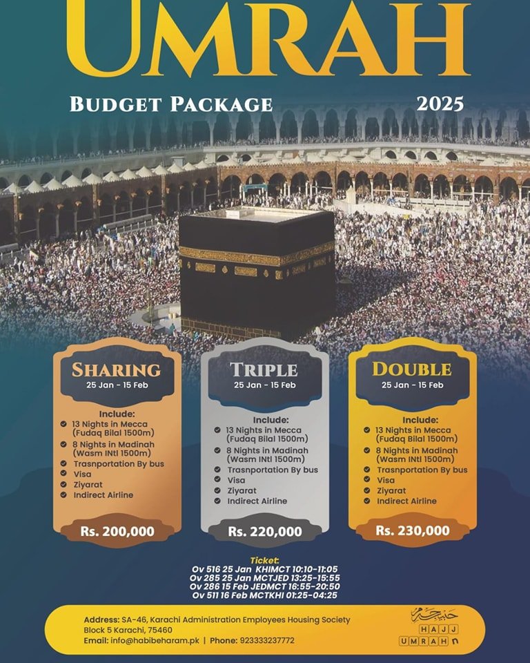 This Umrah Budget Package 2025 is ideal for pilgrims seeking a cost-effective Umrah from Pakistan without compromising essential services.